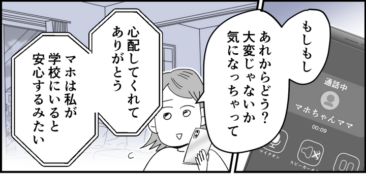 ママ友に会うたび、「マホちゃんママ、毎日学校へ行っているんだってね」「その学年って今大変なんでしょう?」なんて声をかけられることもあります。相当ウワサが広がっているように感じ、シオリちゃん親子が孤立しないか心配になりました。シオリちゃんにメッセージを送ると、電話がかかってきました。