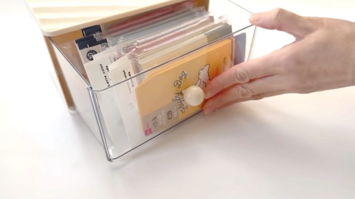手前に傾いた透明な引き出しが特徴で、ロールメモやフレークシール、クリップのような、かわいい雑貨類の【見せる収納】にぴったり!取り出し口が大きいので、適当に入れても使いやすいのがポイントです。デスク以外では、キッチンなどで紅茶のパックやお菓子などを入れてもかわいくディスプレイできそう♪