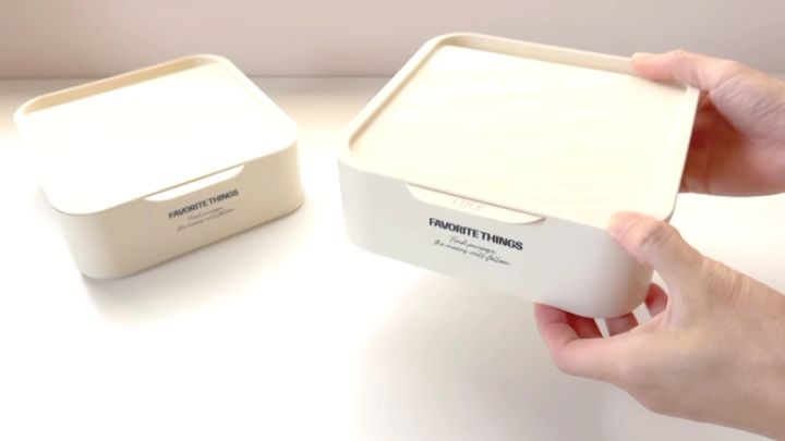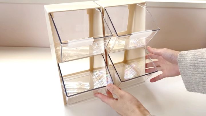 中が見えないので生活感を隠したいときにぴったりな「スタッキングスクエア小物入れ」。