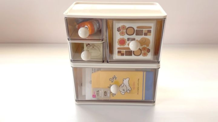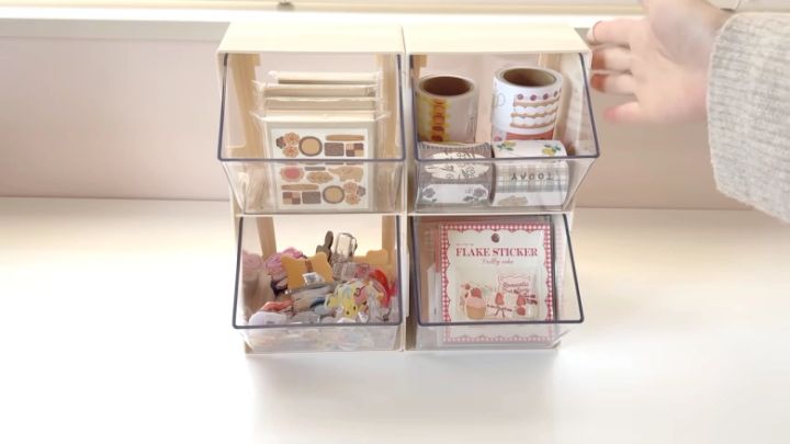 Holiday timeさんは、小さな引き出しにデコレーションテープや小さめのスタンプを収納し、大きな引き出しにはメモ帳を並べてみたそう。そしてこちらの小物入れ3Pは、先ほど紹介した「スタッキングベース小物入れ1P」とスタッキング可能なところもポイント♡自由に重ねて、自分好みの棚を完成させましょう。