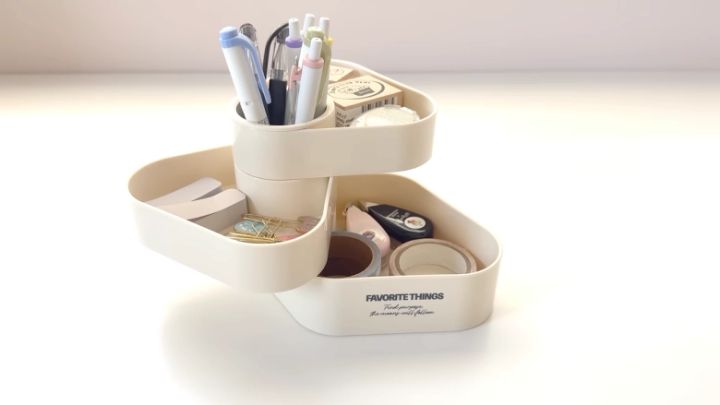 ペン立てを中心に3段のトレイがくるっとスライドする、「小物入れ付きペンスタンド」です。