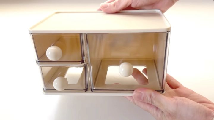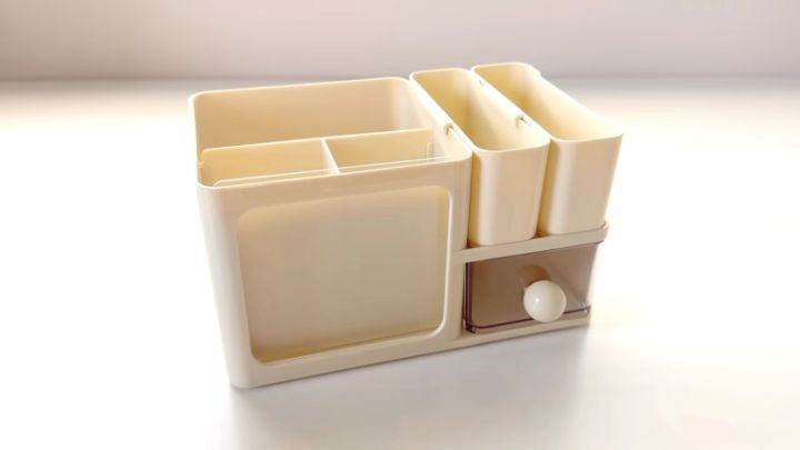 ペン立てや小物入れ、小さな引き出しがひとつになった、多機能な「スタッキングトップオーガナイザー」。