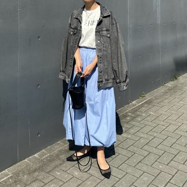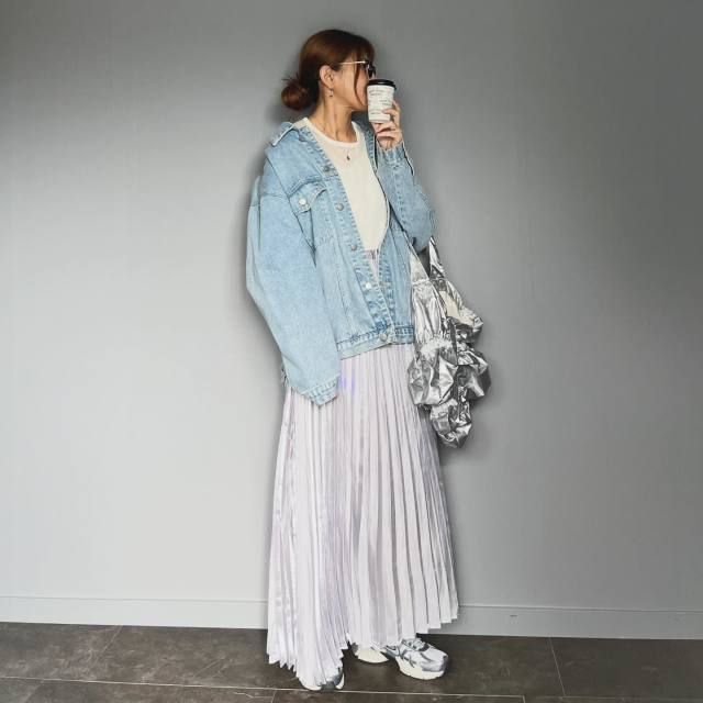 次にご紹介するのは、デニムジャケットに淡いカラーのロングスカートを合わせたコーデ。白やベージュ、シルバーなどの淡色スカートは、抜け感たっぷりな明るい色合いでコーデ全体の洗練感をアップしてくれます。このカラーリングのおかげで、カジュアルなデニムジャケットがグッと大人っぽく見えるんです。