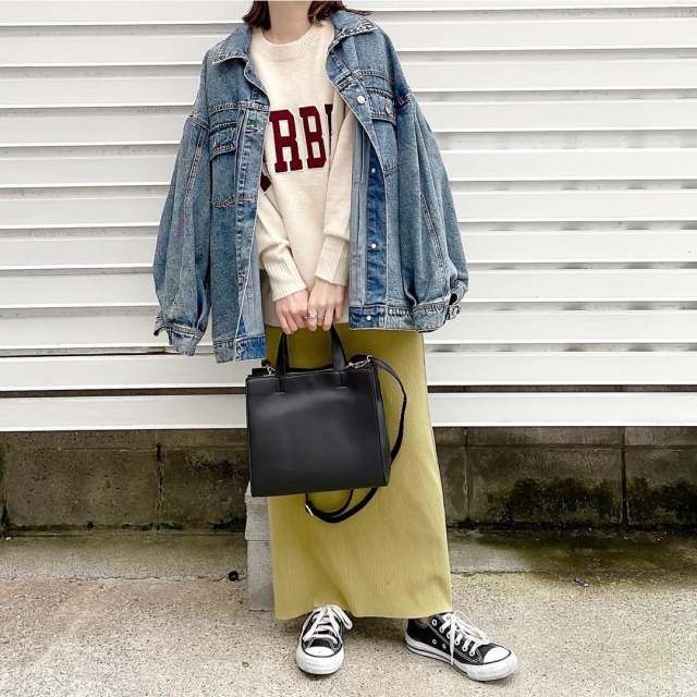 まずご紹介するのは、デニムジャケットにロング丈のタイトスカートを合わせたコーデ。ボトムスのすっきりシルエットで、カジュアルなデニムジャケットも一気に洗練された印象にシフトしますよ。オーバーサイズのデニムジャケットでも、タイトスカートを活用すればシルエットのメリハリがついて大人っぽくまとまります。