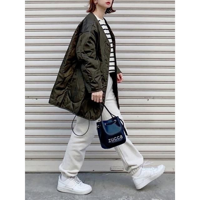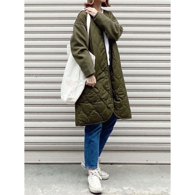 しかしこの時期はまだ寒いので、ニットや厚手のスウェットに羽織るのがおすすめ。ハイネックニットやパーカーなど首元まであるデザインなら、ノーカラーのキルティングコートでも暖かく過ごせますよ。