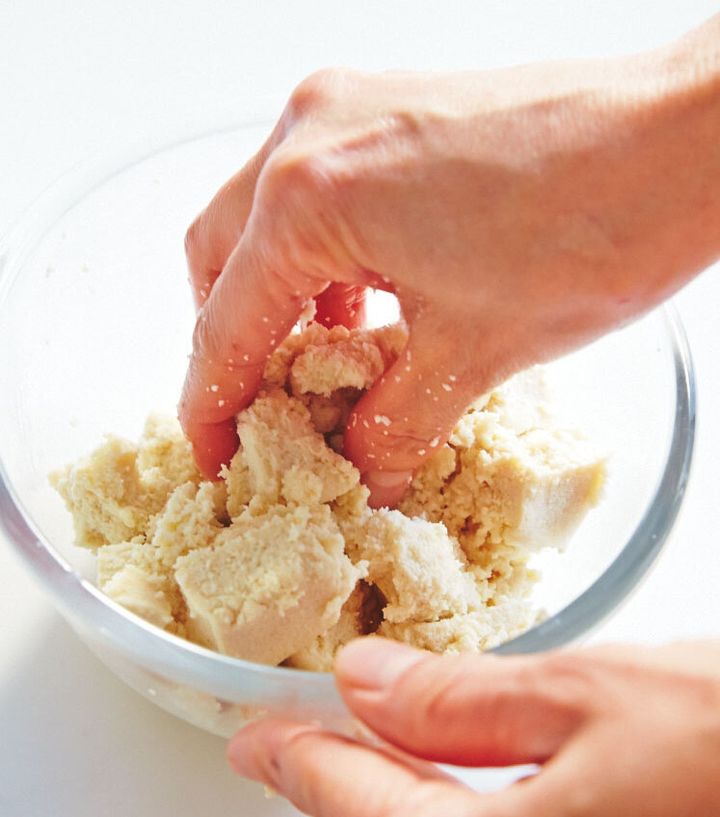 (1)高野豆腐は熱湯にさっと浸してもどし、さましてから水けをしっかりと絞り、そぼろ状にほぐす。アスパラは根元の堅い部分を折り、根元から3cmくらいまでピーラーで皮をむいて、長さを半分に切る。