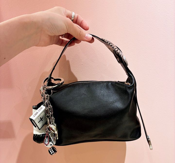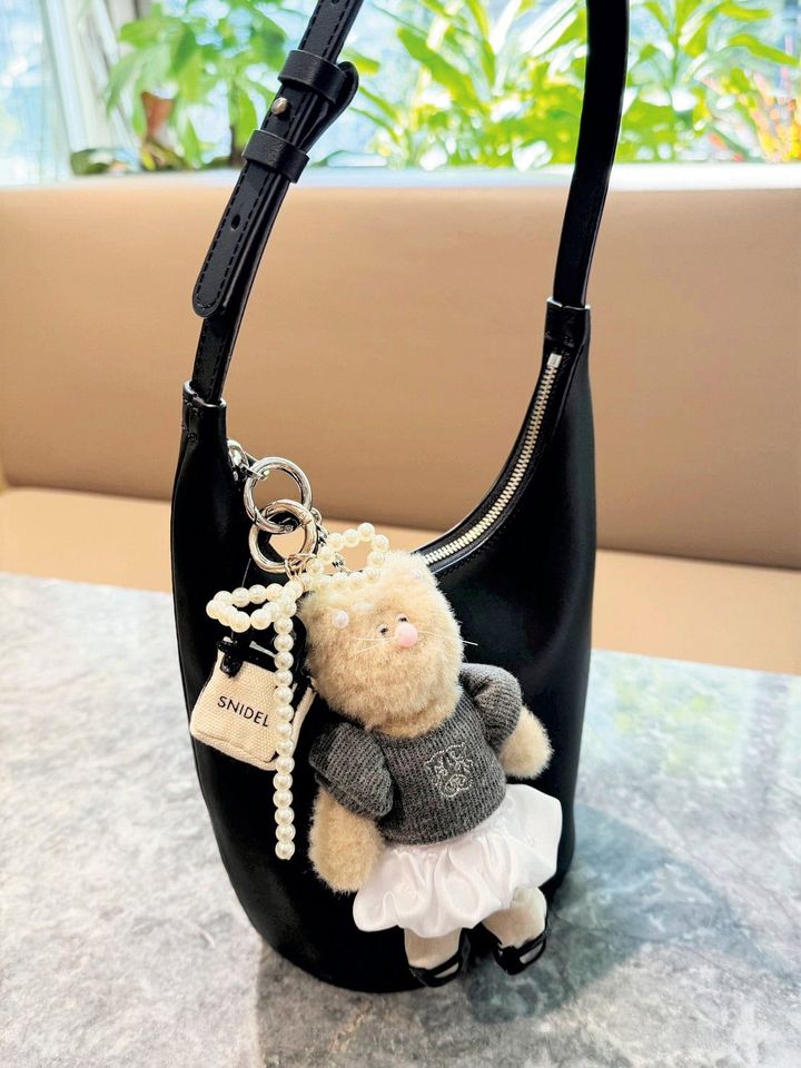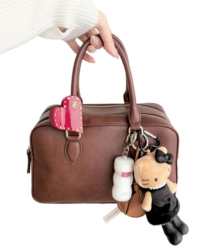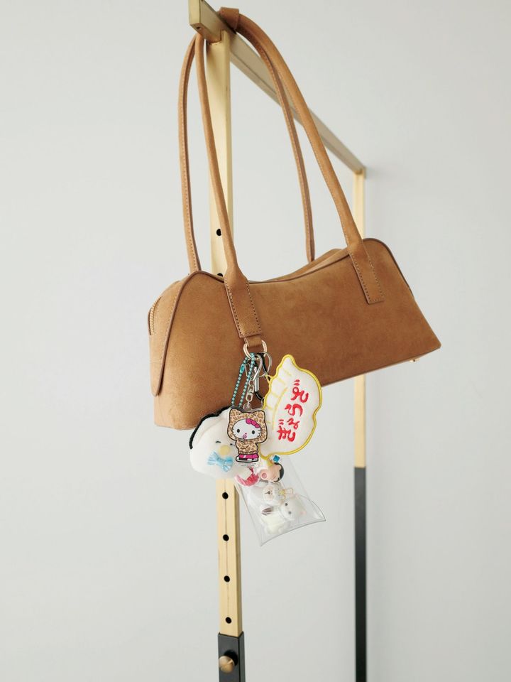 チャームの重ねづけは、トーンをバッグに合わせてまとめているのがポイントです