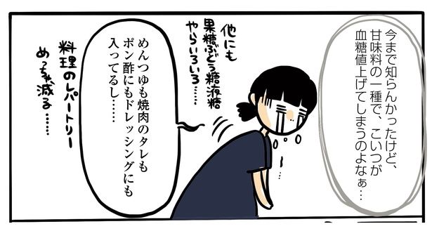 糖質コントロールの結果を左右するのは意外にも調味料だという。著者は成分表を注意深く見るようになり、美味しいものほど糖質が高く、多くの調味料にブドウ糖加糖液糖という血糖値を上げてしまう成分が入っていることに気がついたそうだ。成分の書き方も商品によって違うため、ちゃんと糖質〇グラムと記載のあるものを好んで買っていたと明かす。