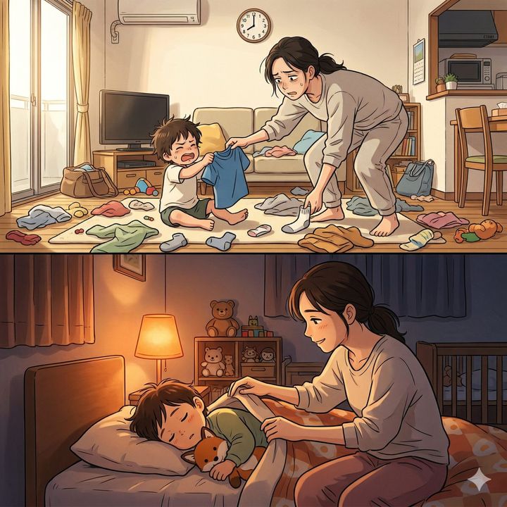 夕食の片付けを終え、散乱したおもちゃを定位置に戻し、電池切れ寸前の体でそっと寝室のドアを開ける。
