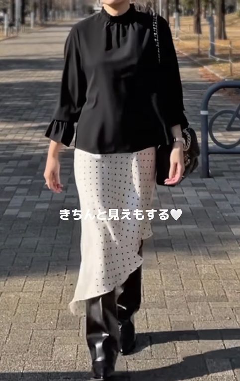 ブラックのフリルスタンドカラーブラウスにドット柄のスカートを合わせた、yc__mamさんの気品漂うコーディネート。ブラウスは首元のフリルが顔まわりを華やかに見せ、袖口のフレアデザインが手元をきれいに演出します。ボトムスには軽やかなアシンメトリー裾のスカートをセレクト。ランダムなドット柄が程よい遊び心を加えつつ、モノトーンでまとめることで落ち着いた印象を与えています。