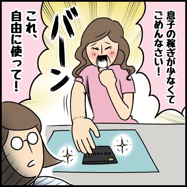 義母は、「息子の稼ぎが少なくてごめんなさい!これ自由に使って!」とブラックカードを差し出してきました。あまりの出来事に、私はしばし放心状態。違うんです、あなたの息子の稼ぎが少ないわけじゃないんです・・・そう言いたかったのに、驚きすぎて言葉が出ませんでした。