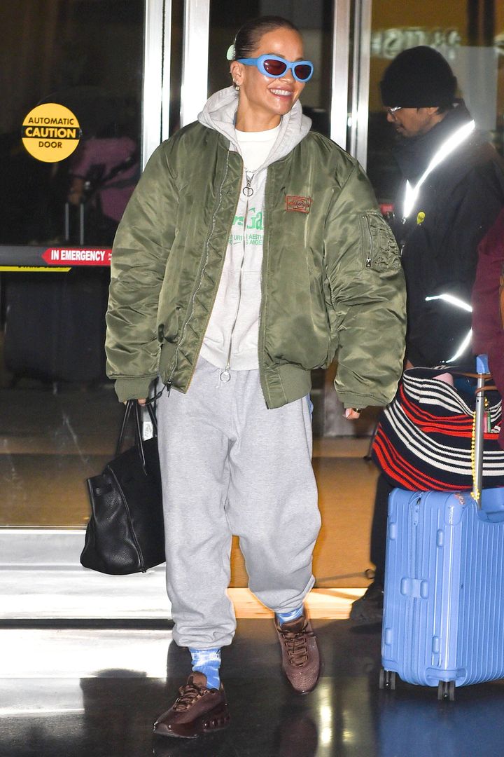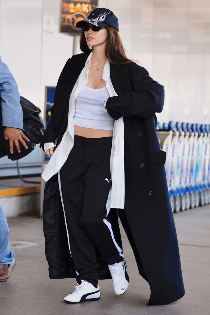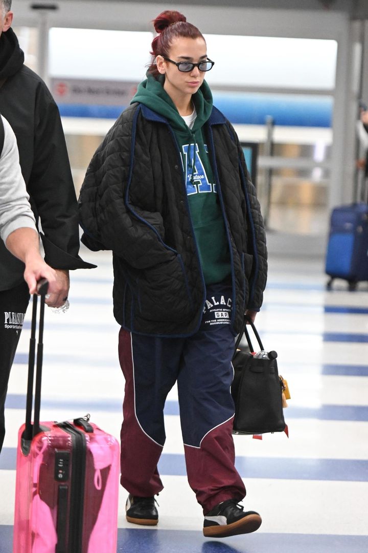 アクティブなトラックパンツも空港ファッションのキーアイテム。おしゃれセレブ筆頭のデュア・リパは、カレッジ風フーディをあわせてやんちゃ系アメカジルックに。