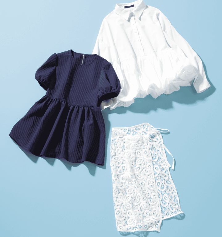 A 裾のバルーンがシンプルなシャツコーデを格上げ。私らしいお仕事ファッションを楽しめる。¥13,800(BLANC)B 甘ブラウスもネイビーなら学校や仕事など活躍の場がアップ。¥16,500(アレア/kokode.jp)Cトレンド感のある巻きレーススカートが会話のきっかけに。¥14,300(アダムエ ロぺ/ジュン カスタマーセンター