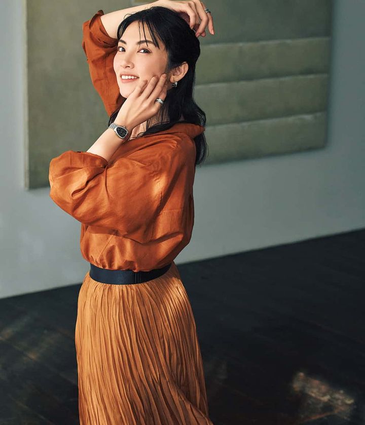 自然体なイメージのブラウンのシャツとスカートで軽やかさを出しつつ、ブラックフェイスの時計で手元を引き締めて。時計だけでなく、ピアスやリングなどのジュエリーとのコーディネートを楽しめるのも、多彩なコレクションを展開する『ブルガリ』ならでは。