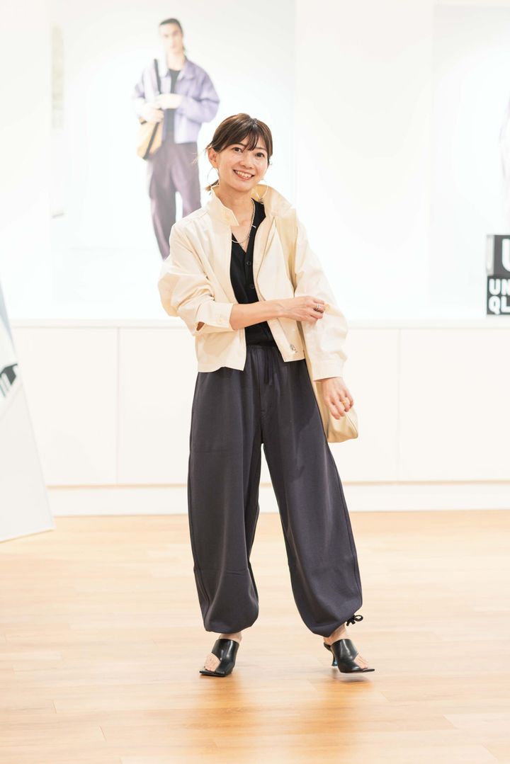 「裏地がなく、すっきりコンパクトなデザイン。短め丈なので、アウターとしてはもちろん重ね着も楽しめる一枚です。ゆったり袖なので、着るだけでこなれた雰囲気に。お洗濯も可能なのも嬉しいポイントです。パンツはややゆったりめのメンズのMサイズをセレクトし、メリハリを効かせました」