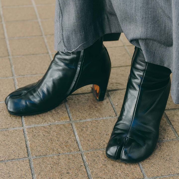 『メゾン マルジェラ』のタビシューズをクローズアップ。ブラックレザーの艶やかな質感でメリハリをオン!