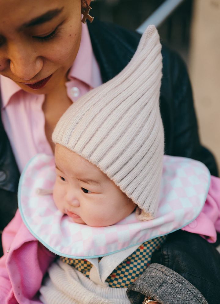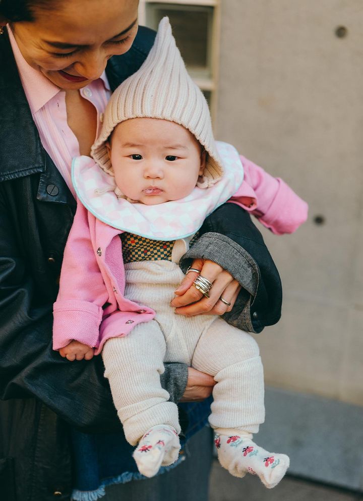 アイボリーのニット帽をキーアイテムにした親子コーデが到着。ママのカラーブロックコーデは、ピンクをベビーとシェアをすることで好バランスに仕上がる。ベビー期だからこそ楽しめる小物づかいもぜひ参考にしてみて。