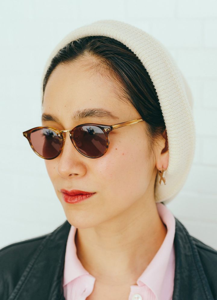 アイボリーのハットで春モードを加速! ほっこりしすぎないよう、べっ甲フレームのメガネ引き締めたのがグッド。
