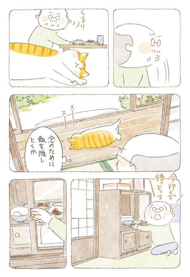 3. おやつの隠し場所を変えてもお見通し。じいちゃんを陰から見つめる鋭い視線/ねことじいちゃん9(43)