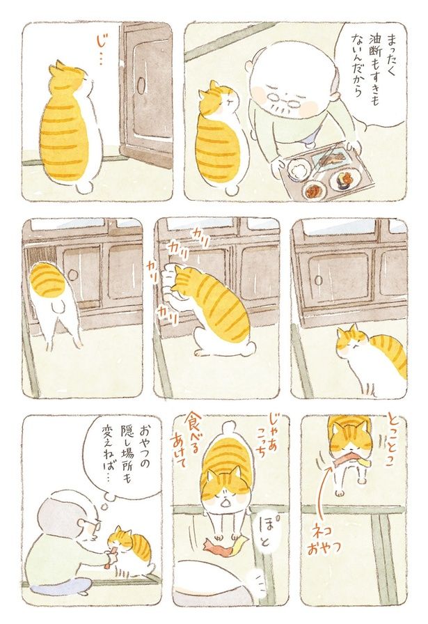 おやつの隠し場所を変えてもお見通し。じいちゃんを陰から見つめる鋭い視線/ねことじいちゃん9(43)