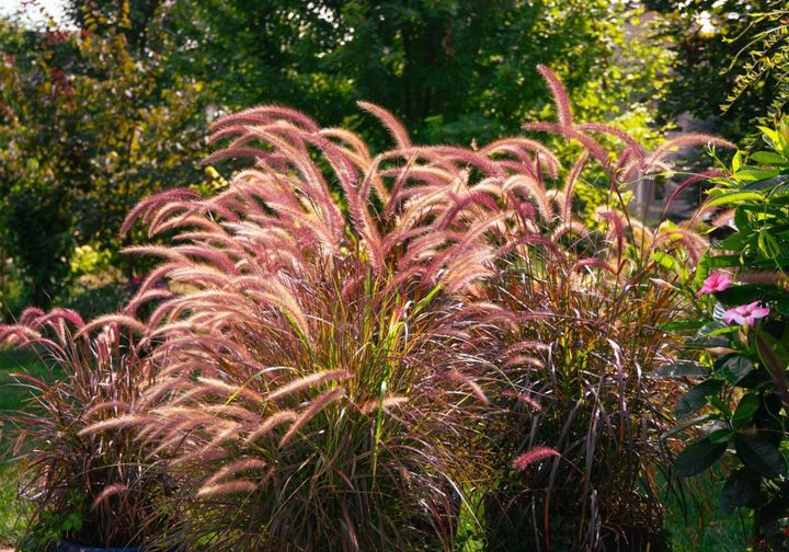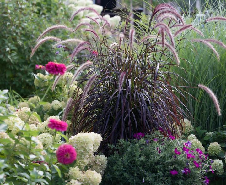 ペニセタムはおもに熱帯原産の多年草なので、日本では冬越しが難しくて一年草扱いになります。なかで、濃い紫色の葉と穂をもつペニセタム‘パープルファウンテングラス’は、最も美しいグラスといわれ、花に負けないほど魅力的。上手に冬越しして大株にできると見事です。