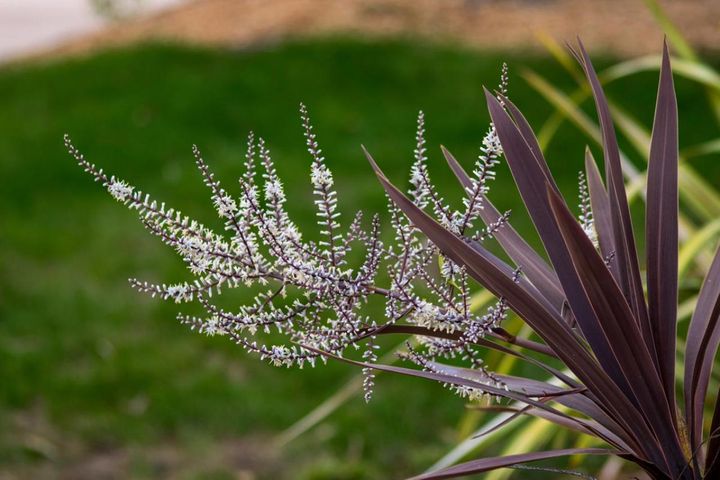 おもに観葉植物として親しまれていますが、耐寒性の高いコルジリネ・オーストラリスは暖地で庭植え可能。販売されている苗はグラスのように見えますが、次第に幹が立ち上がりヤシの木のような樹形になります。赤や紫色などの品種も美しく、花壇に鉢で置いても周囲の緑とよく調和。