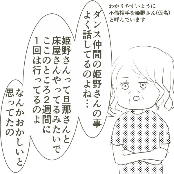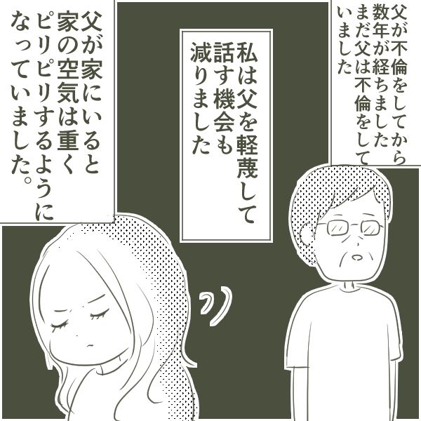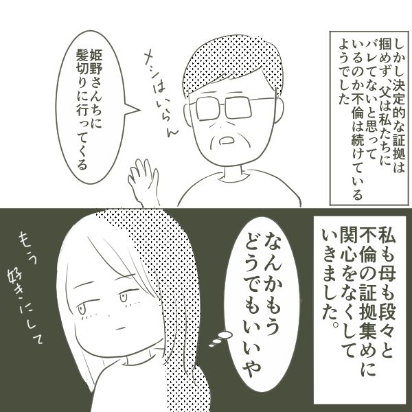 父が頻繁に通うダンス仲間の床屋さん。姫野さん夫婦が経営しているそうです。父の不倫相手も既婚者でした。しかし決定的な証拠は掴めず…。もともと好き勝手に生きてきた父。不倫していようがしていまいが家にいることはろくにありませんでした。母も私も段々と関心がなくなりどうでもよくなりました。