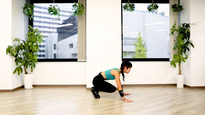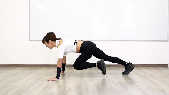 両手と両膝で体を支え、足を浮かせた姿勢になります。 肩幅よりも少し大きめに両手を広げて、腕を曲げて上体を下げた後に、腕を伸ばして元の姿勢に戻りましょう。