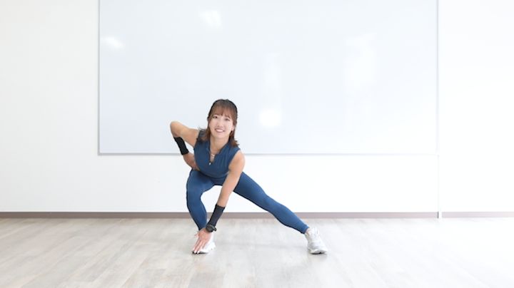 太ももやお尻の筋肉を伸ばしていきます。できるだけリラックスした状態で行いましょう。