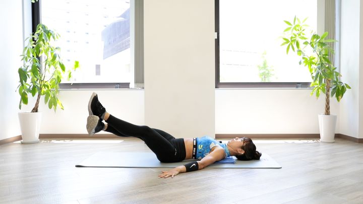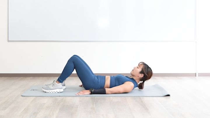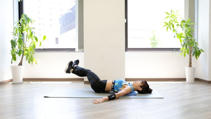 仰向けに寝て膝を90度に立て、お尻の上げ下げを行います。下げたときに、お尻が床につかないようにしましょう。