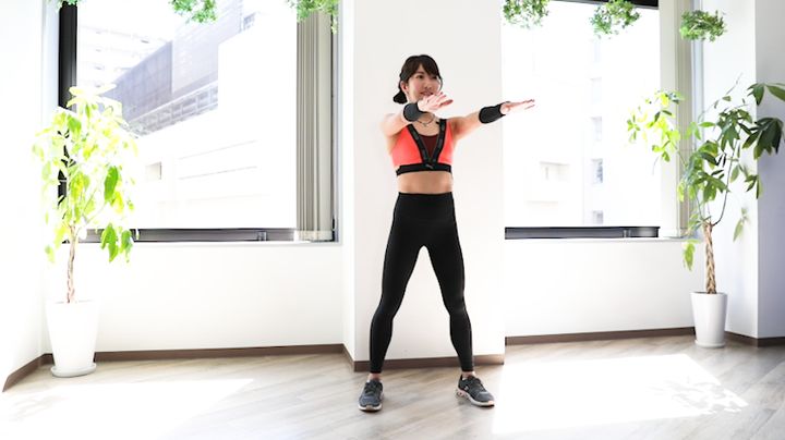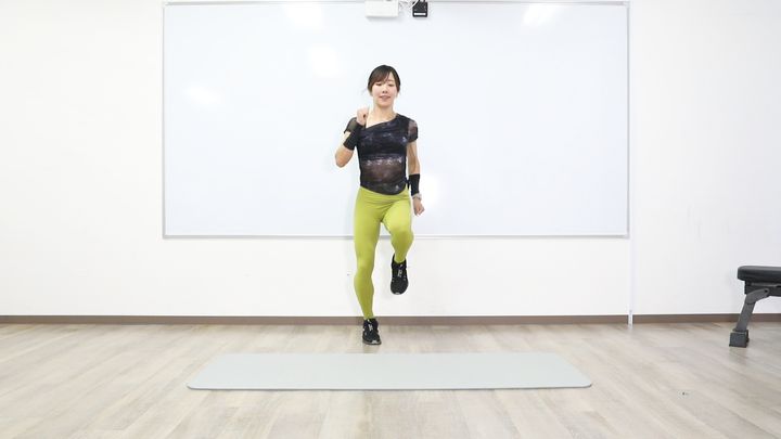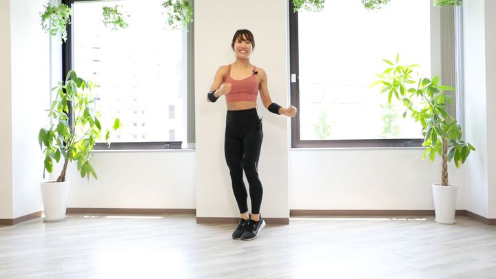 腹筋を立ったまま刺激できるメニュー。ジャンプなどの動きで脂肪を燃やしながら、腹筋にしっかり負荷をかけます。