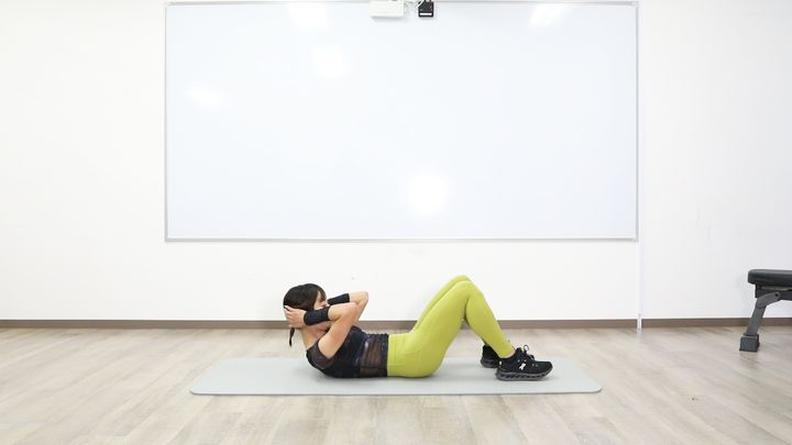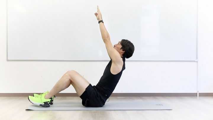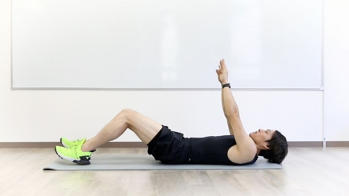 仰向けに寝転がり、膝を軽く曲げ、両手は頭の後ろにセット。お腹を丸めるようにして上体を起こします。