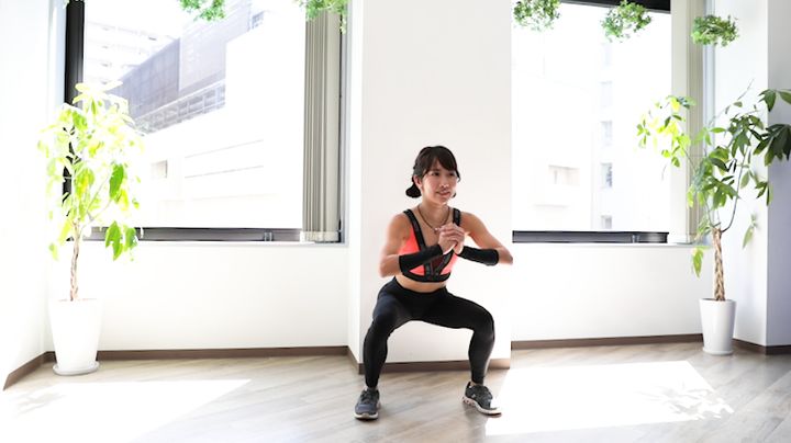 両脚を肩幅くらい位に開き、背筋を伸ばして立ちます。そこから太ももと床が平行になるくらいまでしゃがみ、その後膝を伸ばして元の姿勢に戻りましょう。