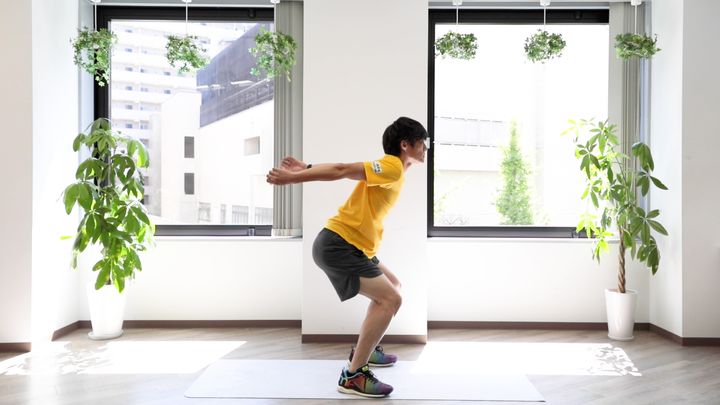 立つ、じゃがむ、脚を伸ばす、ジャンプする、といった順番で行います。大きな動作を心がけましょう。