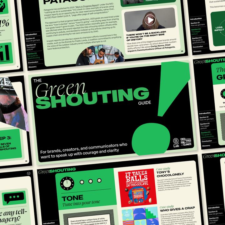 そんな課題に向き合う発信を後押しするのが、B Corp認証を運営する「B Lab」と、オランダ拠点の「Creatives for Climate」が発表した『Greenshouting Guide』だ。企業やブランド、クリエイター、コミュニケーション担当者が、サステナビリティを適切に伝えるための実践的な指針をまとめている。ガイドには、「パタゴニア」や「ヴェジャ」「フォーミュラE」など15社以上の事例研究や、公共部門およびNGOの著名なリーダーたちによる解説を収録。