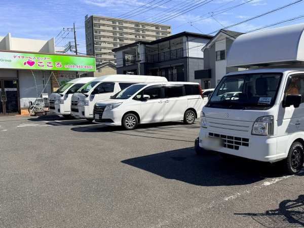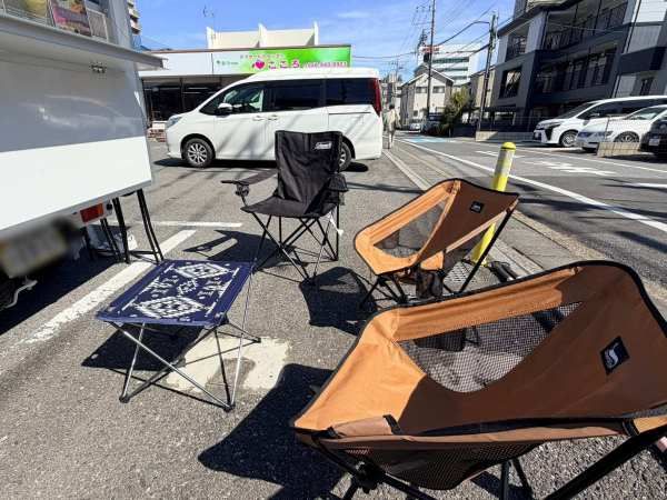 「デイサービスこころ」さん前では、キッチンカーのすぐ横にテーブルとイスが設置されているので、天気のいい日はその場で味わうこともできます。駐車場も利用できるため、家族連れでも立ち寄りやすいのがうれしいポイント。