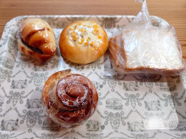 今回購入したのは ・シナモンロール ・コーンマヨ ・あんバターロール さらに、パンを購入した方には、ある時だけ「お米の食パンの端」のお持ち帰りができることもあるそうで、今回ありがたくいただきました。