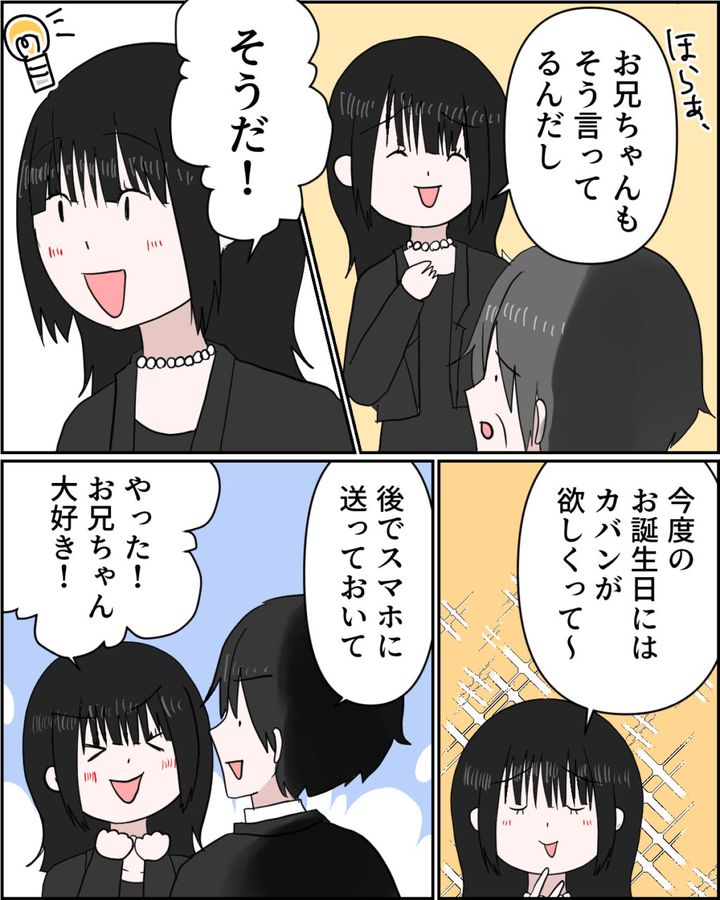 舞花ちゃんは思いついたように「今度のお誕生日にはカバンが欲しくって~」と一段と甘えた声を出しました。すると謙介は迷いなく「後でスマホに送っておいて」と言うので舞花ちゃんは「お兄ちゃん大好き!」と大喜びです。