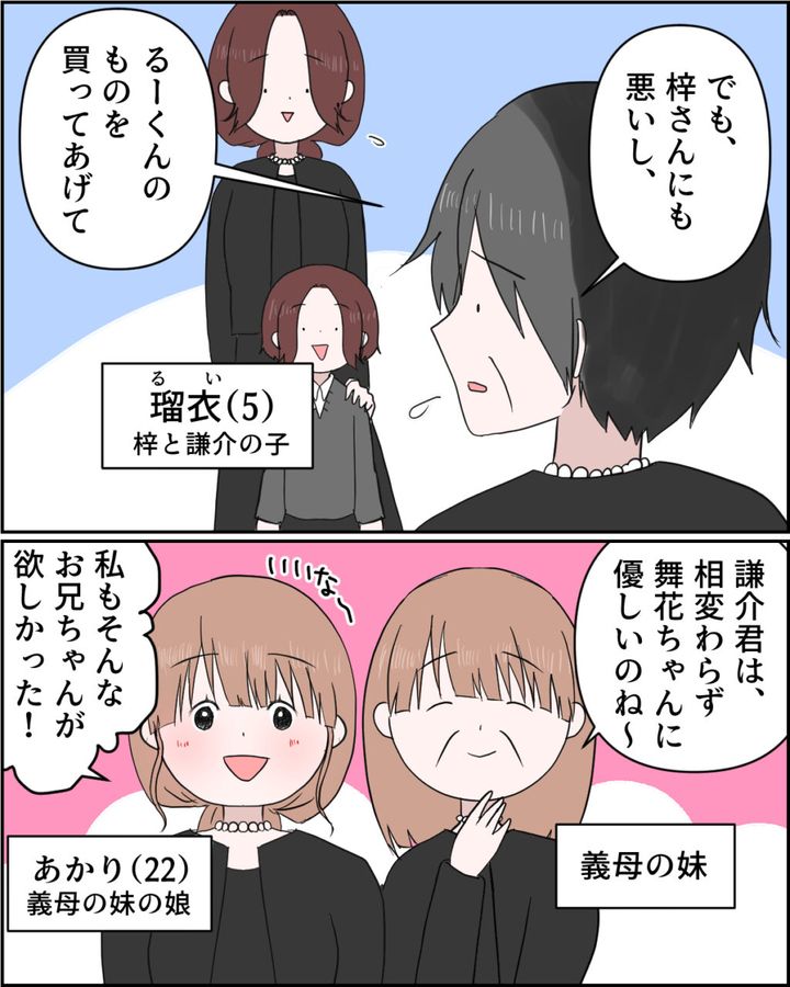 義母は私に気を遣ってくれて「るーくんのものを買ってあげて」と5歳の息子瑠衣のことを気にかけてくれました。義理の叔母と姪も、「謙介君は、相変わらず舞花ちゃんに優しいのね~」「私もそんなお兄ちゃんが欲しかった!」と口々に言うくらい、謙介は昔から舞花ちゃんに甘かったのだろうなと思います。