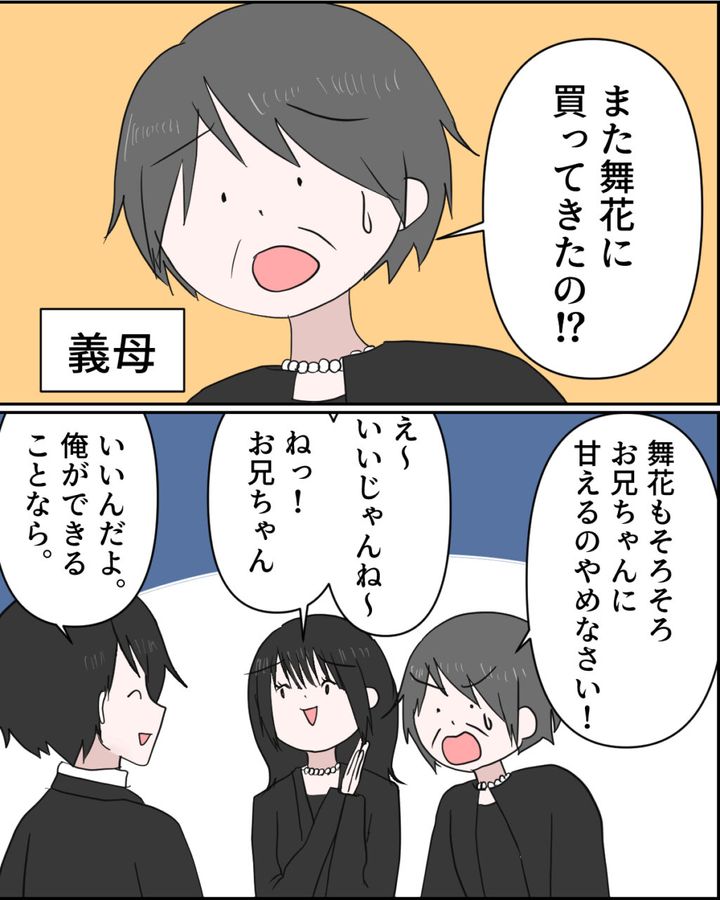 謙介たちの様子を見ていた義母も「また舞花に買ってきたの?」と困ったように口をはさみました。「舞花もそろそろお兄ちゃんに甘えるのやめなさい!」と責めても舞花ちゃんは動じず「え~いいじゃんね、ねっおにいちゃん」と笑顔。謙介も「いいんだよ。俺ができることなら」と満足そうです。