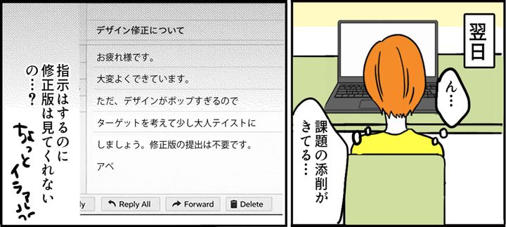 アベさんからは「ポップな雰囲気が強いので、ターゲットを考えてもう少し大人テイストにしましょう」と返ってきました。けれど私はターゲットを考えたうえであえてポップにしたし、大人テイストって指示が抽象的すぎると思うのです。