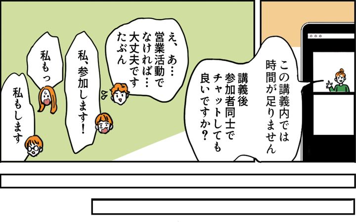 しかし違和感を抱いていたのは私だけではなかったようです。受講者4人でチャットしたところ、講義に対する不満をあらわにしたオニヅカさんに全員「いいね」をつけていたのです。みんな私と同じ気持ちだったのだとわかり、少しホッとしました。