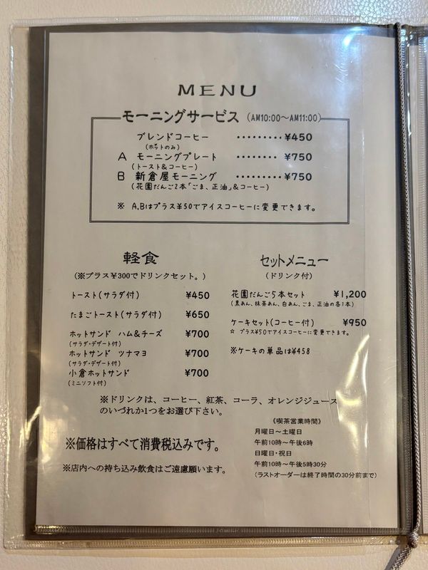 今回お目当てのモーニングは開店10時から11時まで1時間限定で提供。メニューは「ブレンドコーヒー」、「モーニングプレート(トースト&コーヒー)」、「新倉屋モーニング(お団子&コーヒー)」の計3種類があります。