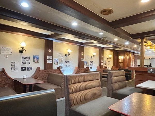 想像より何倍も広いレトロな喫茶スペースが登場!ボックスタイプの席がずらっと並び、街中を忘れるような寛ぎの空間が広がります。