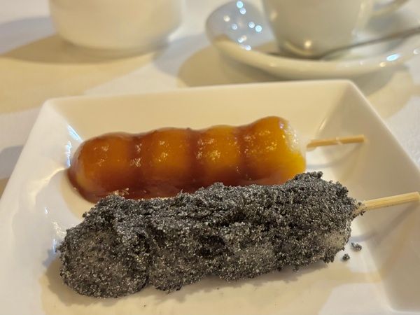 焦がし醤油をまとったお団子は深い正油の旨みが特徴的!胡麻と対照的に甘さはほとんどなく、シンプルなお団子の味わいが引き立ちます。2種類どちらもビターなコーヒーと相性◎