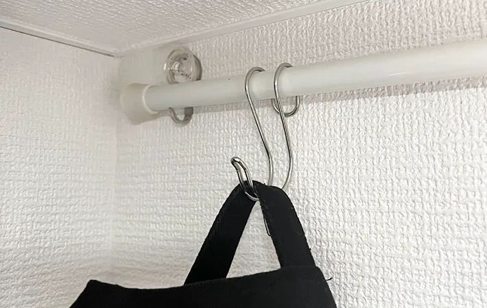フックを壁につけて、つっぱり棒を掛けた様子(撮影:Classy Life)