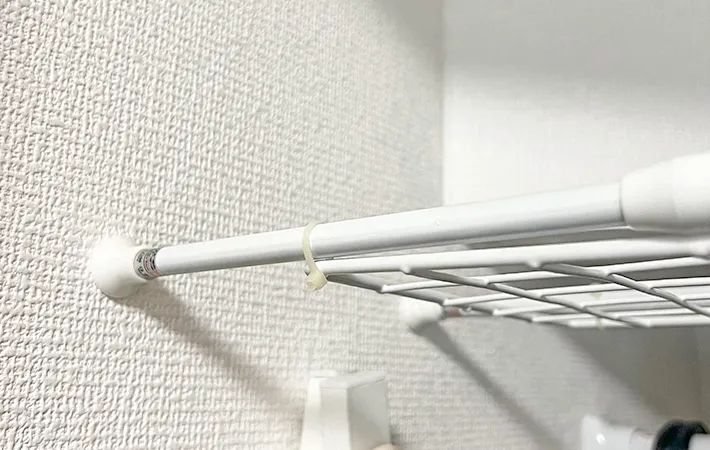つっぱり棒にワイヤーネットを結びつけて枕棚に(撮影:Classy Life)