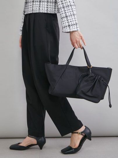 撥水加工を施したナイロンバッグなので、悪天候の日も安心。ナイロンならではのツヤ感が高級感を演出します。サイドの紐を絞らず、トートバッグとして使うほか、キュッと絞って巾着風にするのも◎。カラビナで簡単に取り外せる、同素材の巾着付きです。