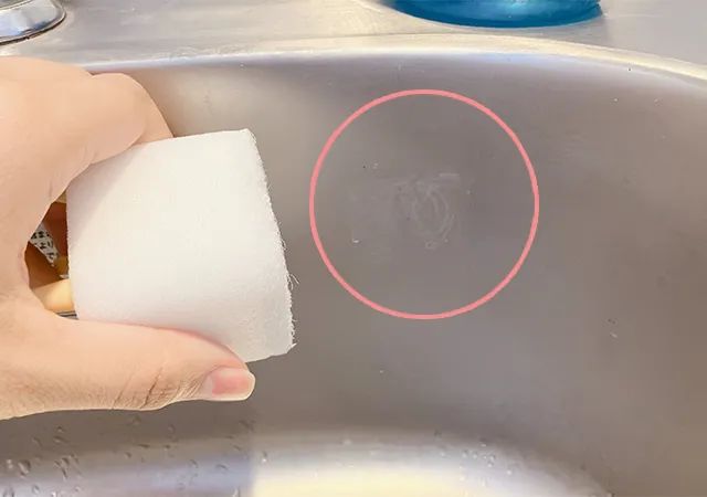 筆者は、ステンレス製のシンクの、白くなっていた水アカを『立つおそうじキューブ』で掃除してみることに。