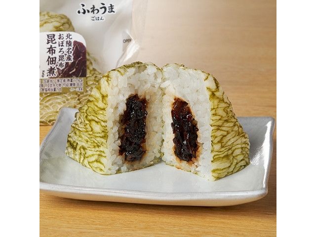 北陸地方でおなじみのおぼろ昆布で包んだ仕立てのおむすびです。ご飯の進む甘辛い味付けの昆布佃煮を包みました。 北陸で販売